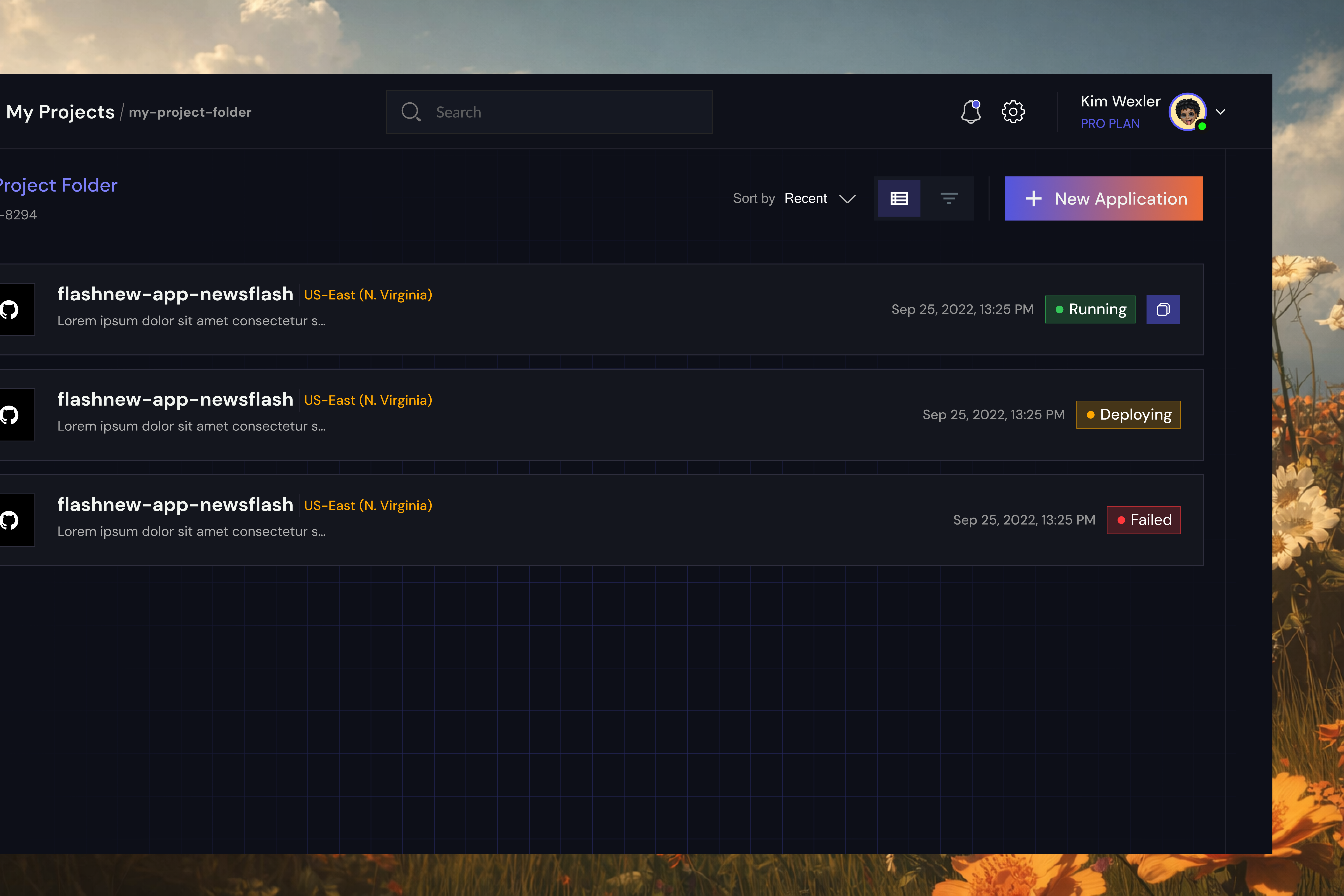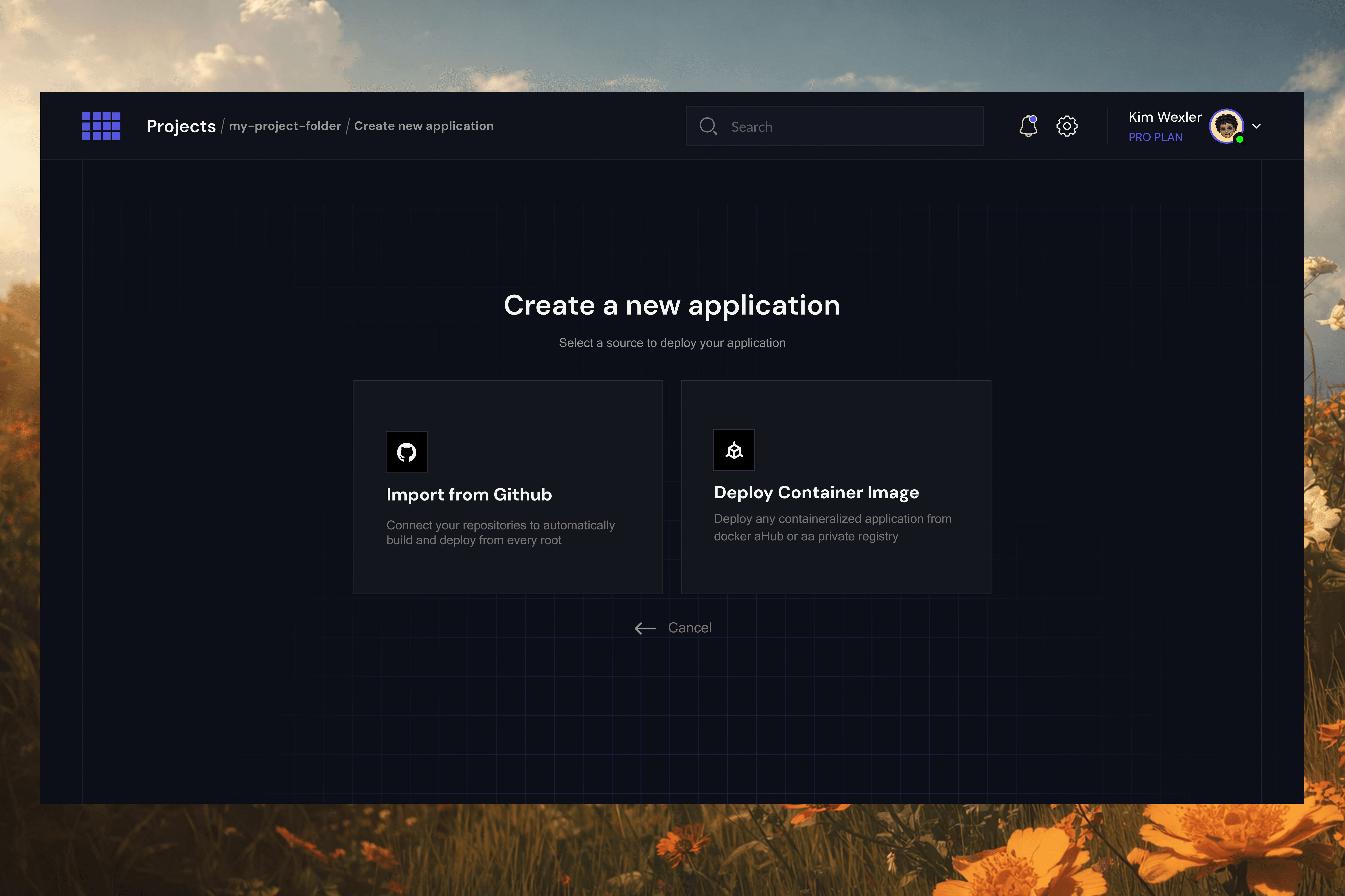 The platform supports two primary deployment workflows: deploying directly from GitHub repositories or deploying from container images. For GitHub-based deployments, users can connect their repositories, select branches, and automatically build and deploy applications with support for continuous updates. For container-based deployments, users can launch applications by providing a container image, making it flexible for teams using custom build pipelines or existing images.